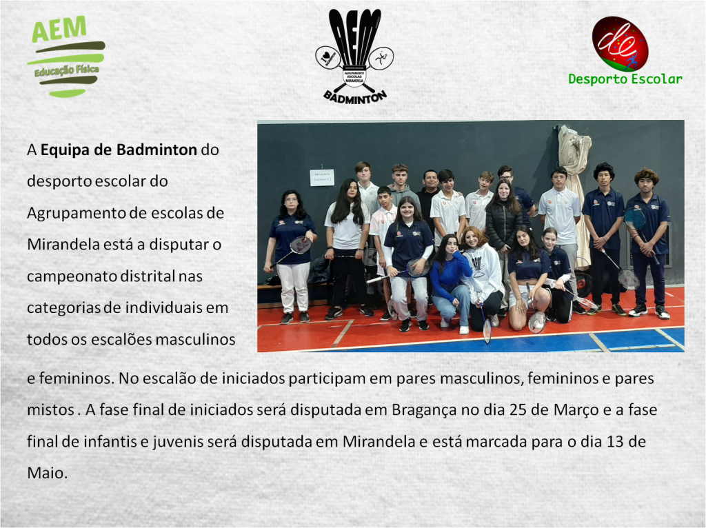 Equipa de Badminton do Agrupamento by Marco Marujo14 de Março, 202314 de Março, 2023Desporto Partilhar Equipa de badminton do Agrupamento de Escolas de Mirandela que participa no campeonato distrital do desporto escolar.