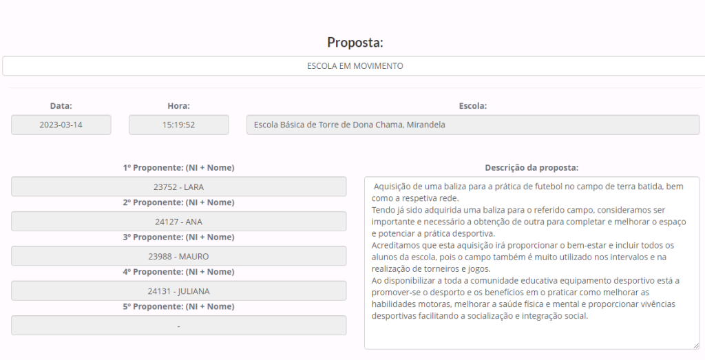 Proposta a votação ESCOLA BÁSICA DE TORRE DE DONA CHAMA [Orçamento Participativo das Escolas 2023] by avelens15 de Março, 202329 de Março, 2023AVISOS Partilhar A única proposta submetida para votação no dia 24 de Março: Proposta – ESCOLA EM MOVIMENTO Dia 24 de março – VOTEM
