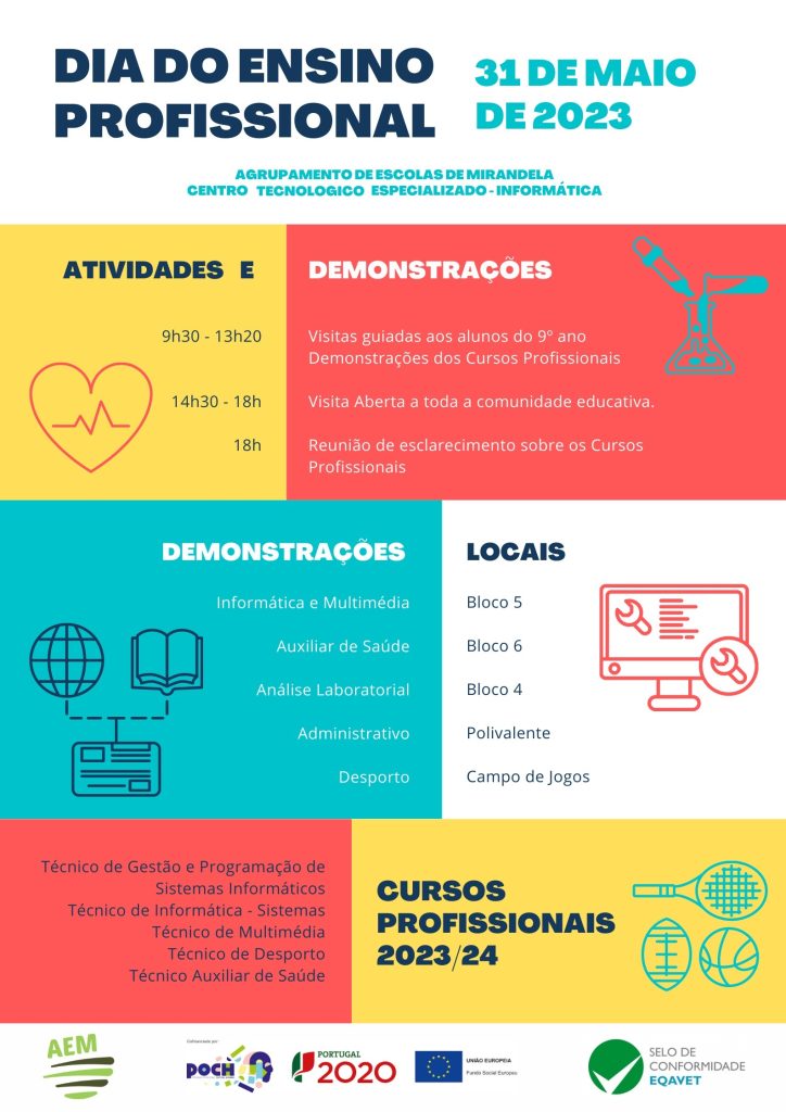 Neste dia serão dinamizadas atividades, pelos alunos dos cursos profissionais, com o objetivo de dar a conhecer o trabalho realizado durante o ano letivo e promover os cursos profissionais para o ano letivo 2023/24.