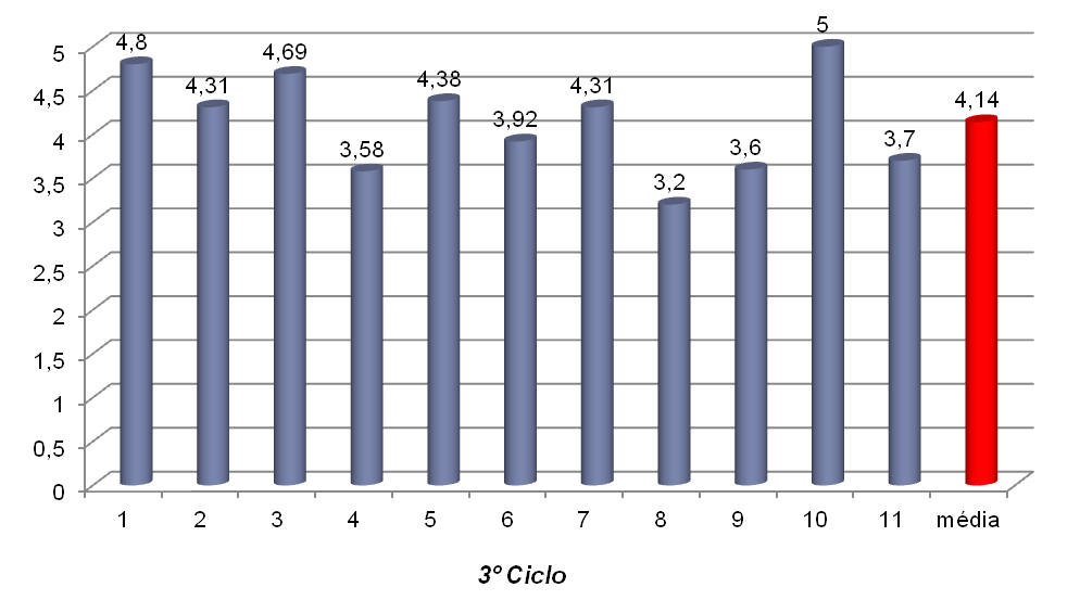 No terceiro ciclo a média das classificações dos onze AA foi de 4.14 valores, no entanto, três AA obtiveram uma classificação inferior a três valores. Dois AA obtiveram nível 2 à disciplina de Físico-química e um à disciplina de Inglês. Salientamos pela positiva uma AA que obteve a classificação de 5 valores a todas as disciplinas.